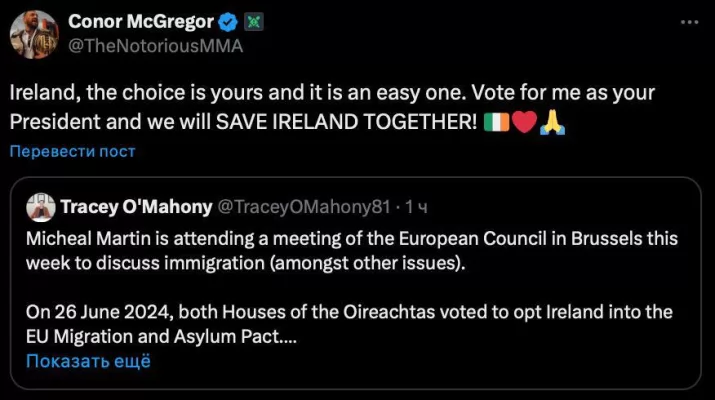 «Ирландия, выбор за тобой, и он прост. Голосуй за меня как за своего президента, и мы ВМЕСТЕ СПАСЕМ ИРЛАНДИЮ!»
