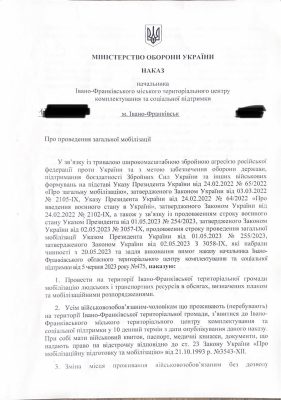 Начальник Ивано-Франковского городского территориального центра комплектования (так на Украине называют военкоматы) издал приказ об обязательной явке всех военнообязанных в городской ТЦК в десятидневный срок.