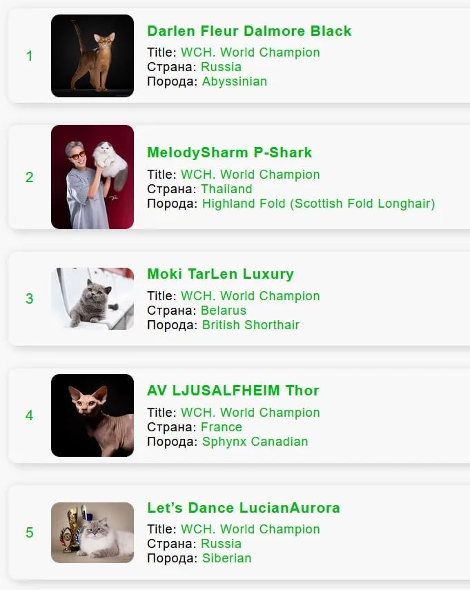 Абиссинский кот по кличке Darlen Fleur Dalmore Black за прошлый год набрал 19,700 баллов. Второе место у шотландского длинношерстного вислоухого кота MelodySharm P-Shark из Таиланда, а третье забрал британский короткошерстный кот Moki TarLen Luxury из Беларуси.
