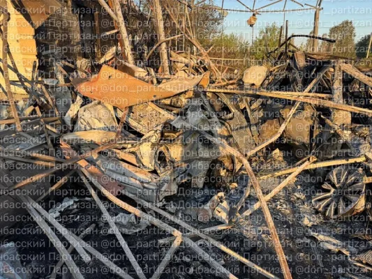 - Полученные фотоснимки с места попадания однозначно подтверждают уничтожение временной базы размещения техники и личного состава. На кадрах зафиксированы полностью сгоревшие шасси колёсной техники, разрушенные ангары и обломки крупногабаритных грузовиков, характерных для армейского автопарка. Также видны следы вторичных детонаций, вызванных вероятным наличием БК.