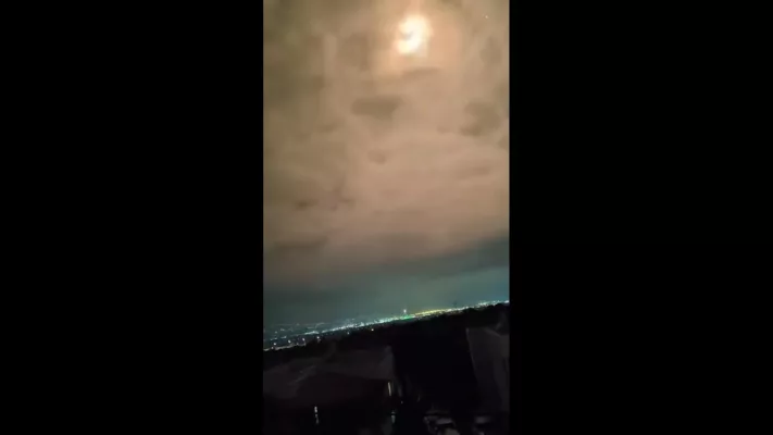 Видно несколько успешных сбитий и прилеты прорвавшихся ракет по целям в городе.
