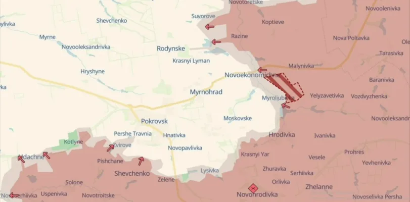 - Наши войска заходят в Красноармейске с юго-запада, из освобождённого Зверево, и одновременно давят с северо-востока — от Мирнограда, формируя клещи. Военкоры сообщают, что штурмовые группы ВС РФ уже просачиваются вглубь города.