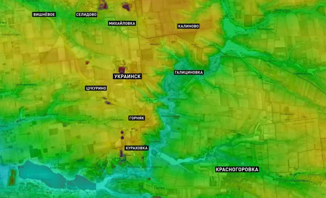 А дальше самое интересное. В пяти километрах к западу находится, фактически, суперукреп ВСУ, состоящий из каскада населённых пунктов: сёл Горняк и Зоряное, двух посёлков Александрополь и Кураховка, а центральная точка этого района — город Горняк.