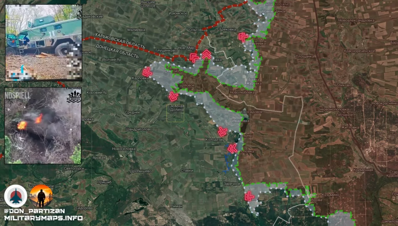 - В районе Зелёной Долины идут интенсивные боевые действия, в результате которых подразделения ВС РФ увеличили зону контроля до 200 метров по ширине фронта и 350 метров вглубь. Это даёт российской армии преимущество в этом секторе.