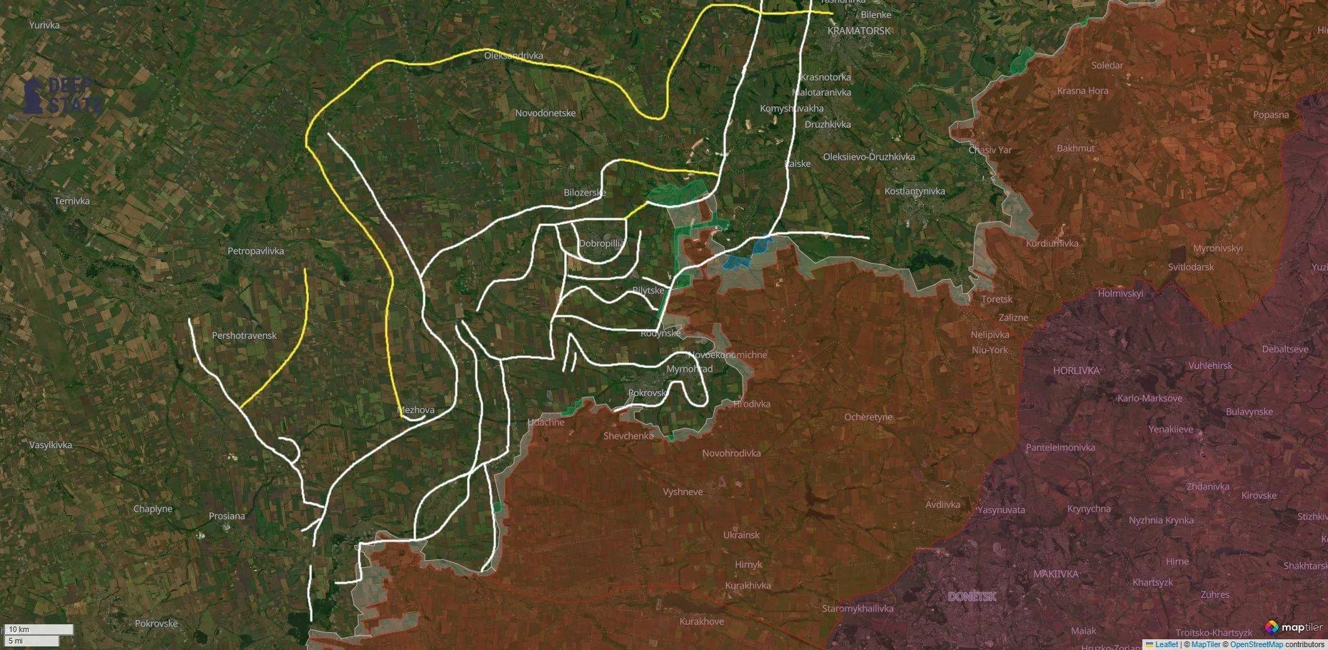 Особый интерес в этой связи вызывает обозначенная на картах «жёлтая линия» — так называемый последний рубеж обороны в 30 км западнее Покровска. Если верить тем же западным аналитикам (часто проукраинским), то там уже построен второй «оборонительный пояс» протяжённостью более 300км, пройти который невозможно. Но по открытым спутниковым данным установить факт её строительства невозможно: даже регулярные обновления снимков не фиксируют масштабных земляных работ или возведения бетонных конструкций.