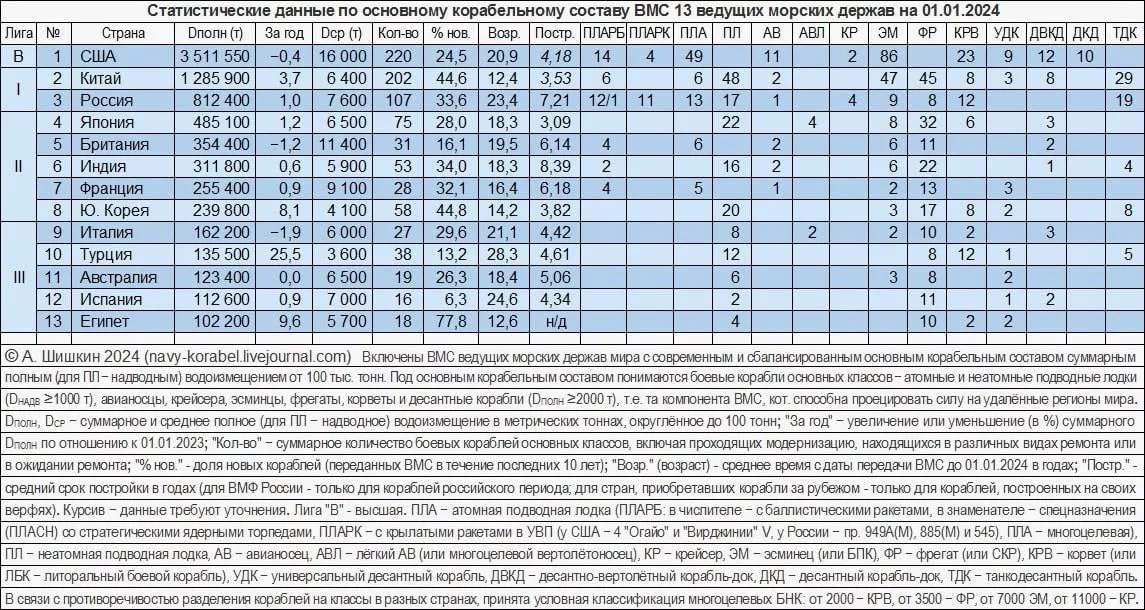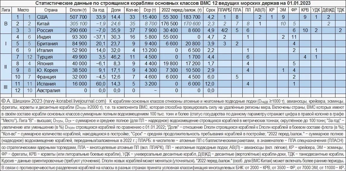 Давайте вкратце разберемся с корабельным составом ведущих морских держав мира, и сколько сейчас строится кораблей. Для этого взглянем на сводные таблицы за авторством А. Шишкина. На первом изображении приведена подробная статистика по актуальному корабельному составу крупнейших ВМС мира, а на втором — по строительству крупных боевых кораблей в этих странах. Конечно, нельзя оценить боеспособность флота только по количеству вымпелов и их суммарному водоизмещению, так как не учитывается состав вооружения кораблей, насколько удачные те или иные проекты, состояние инфраструктуры, возможности промышленности и уровень организации, но можно оценить создаваемые формирования и решаемые ими боевые задачи.