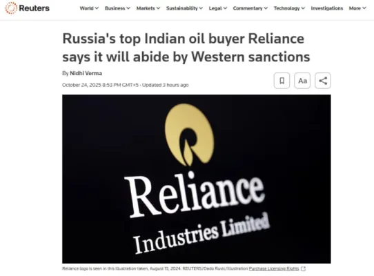 Отмечается, что компания Reliance ранее заключила долгосрочное соглашение о покупке почти 500 000 баррелей сырой нефти в сутки у российской нефтяной компании «Роснефть».