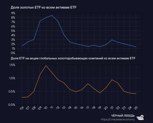 Всё больше появляется подтверждений, что состоятельные клиенты западных банков всё меньше им доверяют. Падает интерес даже к металлическим счетам, номинированным в золоте: им нужен реальный физический металл. Даже паи биржевых фондов (ETF), ориентированных на золото, теряют интерес инвесторов. Как, собственно говоря, и ETF, держащие портфель в акциях глобальных добытчиков этого металла.