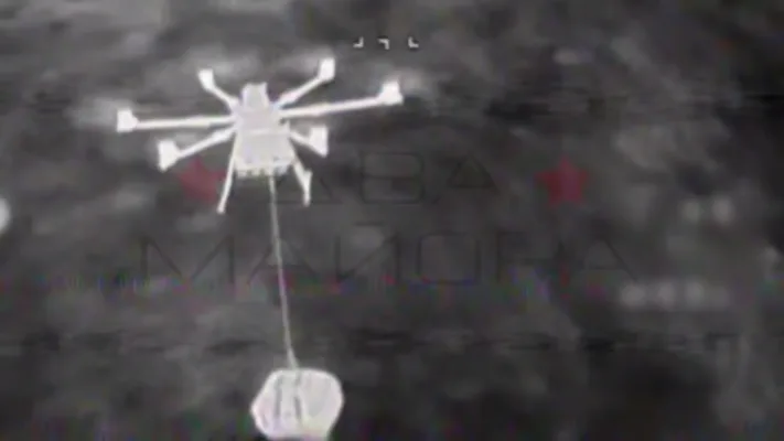 Противник активно использует свои тяжёлые дроны для снабжения подразделений. На кадрах отчётливо видны подвязанные к беспилотнику припасы 00:55.