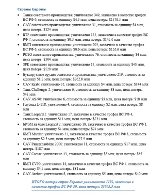 В отчете не учитывались потери в автомобильной технике, которые составили 2654 единицы. Также проблематично перевести в денежный эквивалент стоимость: стрелкового оружия, средств индивидуальной бронезащиты, связи, мобильных РЭБ, продовольствия и других материальных средства обеспечения боевых подразделения.