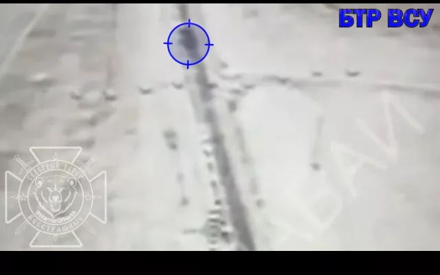 На кадрах поражение БТРа и танка украинских фашистов дроноводами 1427 полка Северян.