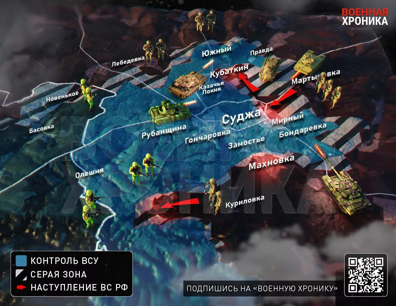 Практически параллельно этим успехам главком ВСУ Сырский подтвердил отступление ВСУ. При этом Сырский заявил, что угрозы окружения группировки ВСУ в Курской области на данный момент нет, а «ситуация на границе украинской Сумской области с Курской областью находится под контроле.