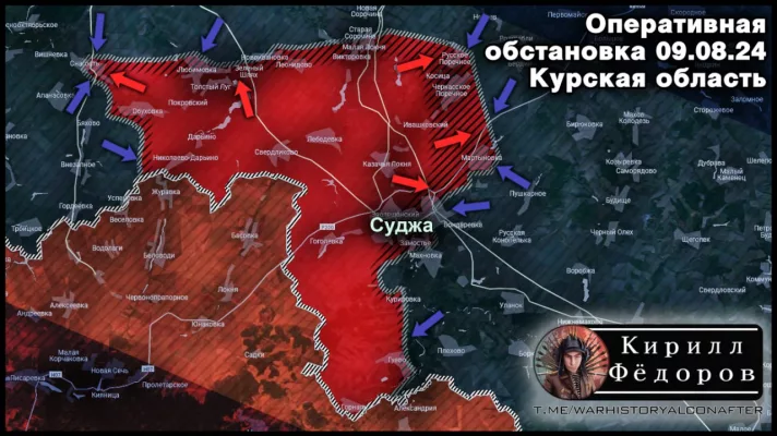 ▪️В самой Судже по официальным данным ВСУ до сих пор нет, они присутствуют на западной границе города. Однако по неофициальным данным в городе идут бои, а ВСУшники фоткаются у местного филиала «Газпром Газораспределение» на самой северо-западной окраине и у магазина «Пятёрочка». Также, по неофициальной информации в Судже вечером вновь вспыхнули бои, храбро сражаются морпехи 810 гвайдейской.