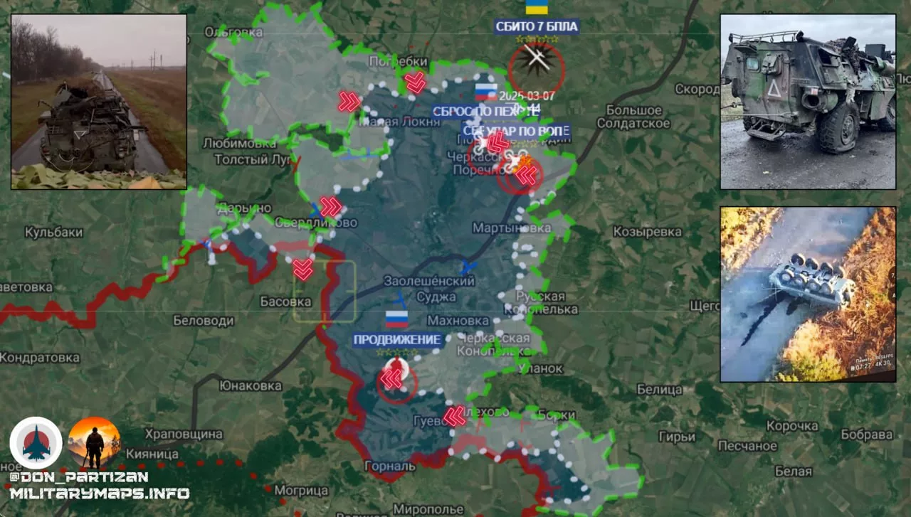 На Курском направлении российские войска продолжают развивать тактическое наступление, оказывая давление на украинские позиции и углубляя контроль вдоль границы. ВСУ пытаются стабилизировать фронт, однако потеря ключевых рубежей создаёт угрозу дальнейшего продвижения российских подразделений.