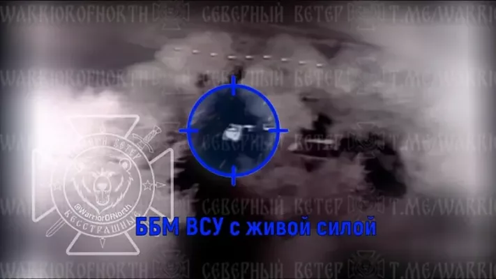 FPV-расчет 810 бригады морской пехоты группировки «Север» поймал вражескую ББМ на полном ходу дроном-камикадзе. Второй дрон зафиксировал уничтожение.