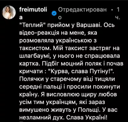 «Тёплый» приём в Варшаве. Вот видеореакция на меня, когда я говорила по-украински с таксистом. Мой таксист застрял на шлагбауме, у него не сработала карта. Подбежал крепкий поляк и начал кричать: «Курва, слава Путину!». Пожилые польки показывали средние пальцы и просили покинуть страну»