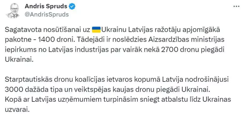 Об этом заявил министр обороны страны Андрис Спрудс в X.