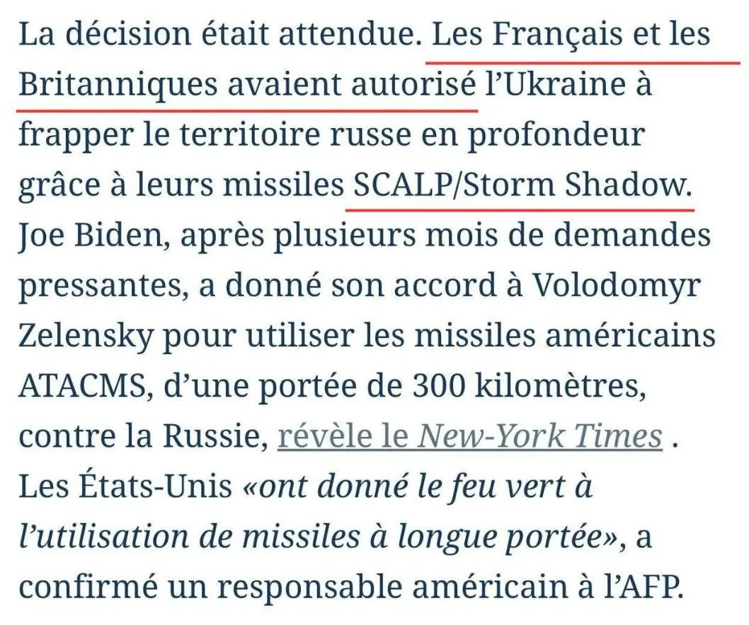 Газета опубликовала статью, где говорилось, что Франция и Великобритания разрешили Киеву бить вглубь РФ ракетами SCALP и Storm Shadow