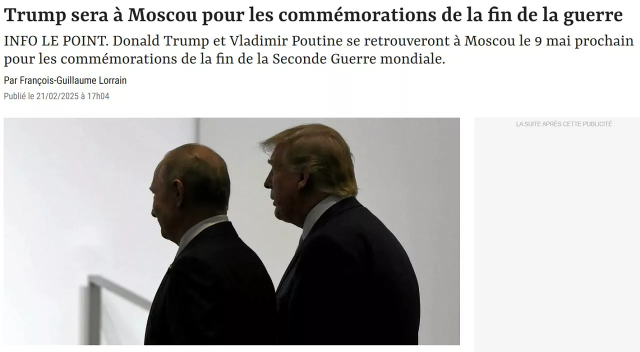 По его «Le Point» два президента будут праздновать в Москве 9 мая «их общее соглашение по миру в Украине. Мирные переговоры, согласно плану Келлога, завершатся 9 мая. И, таким образом, 9 мая 2025 года станет днём их триумфа».