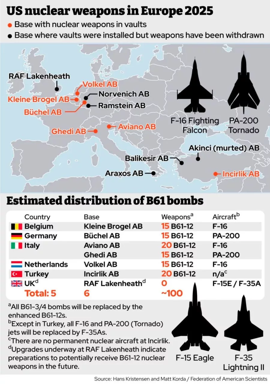 У Пентагона есть давняя договоренность с НАТО, известная как «ядерный обмен», в соответствии с которой он согласился разместить около 100 бомб B61 на совместных базах ВВС США в Бельгии, Италии, Нидерландах, Германии и Турции.