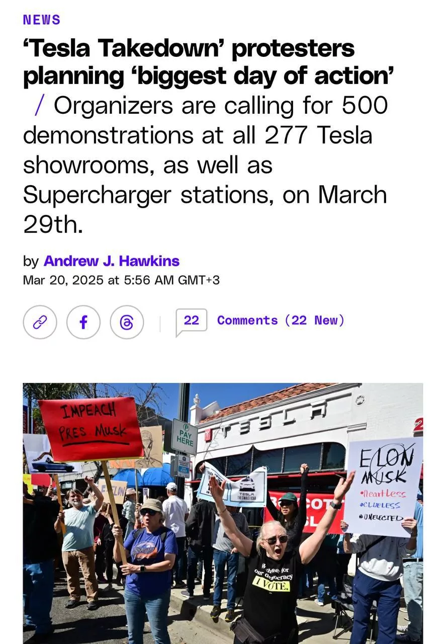 - 29 марта протестующие намерены провести 500 демонстраций перед 277 автосалонами и зарядными станциями Tesla по всему миру.Протесты против компании и её владельца начались в начале февраля и переросли в случаи вандализма (видео), поджогов и насилия. Среди протестующих — тысячи уволенных из-за инициатив Маска в Белом доме. С конца прошлого года акции Tesla упали на 40%.