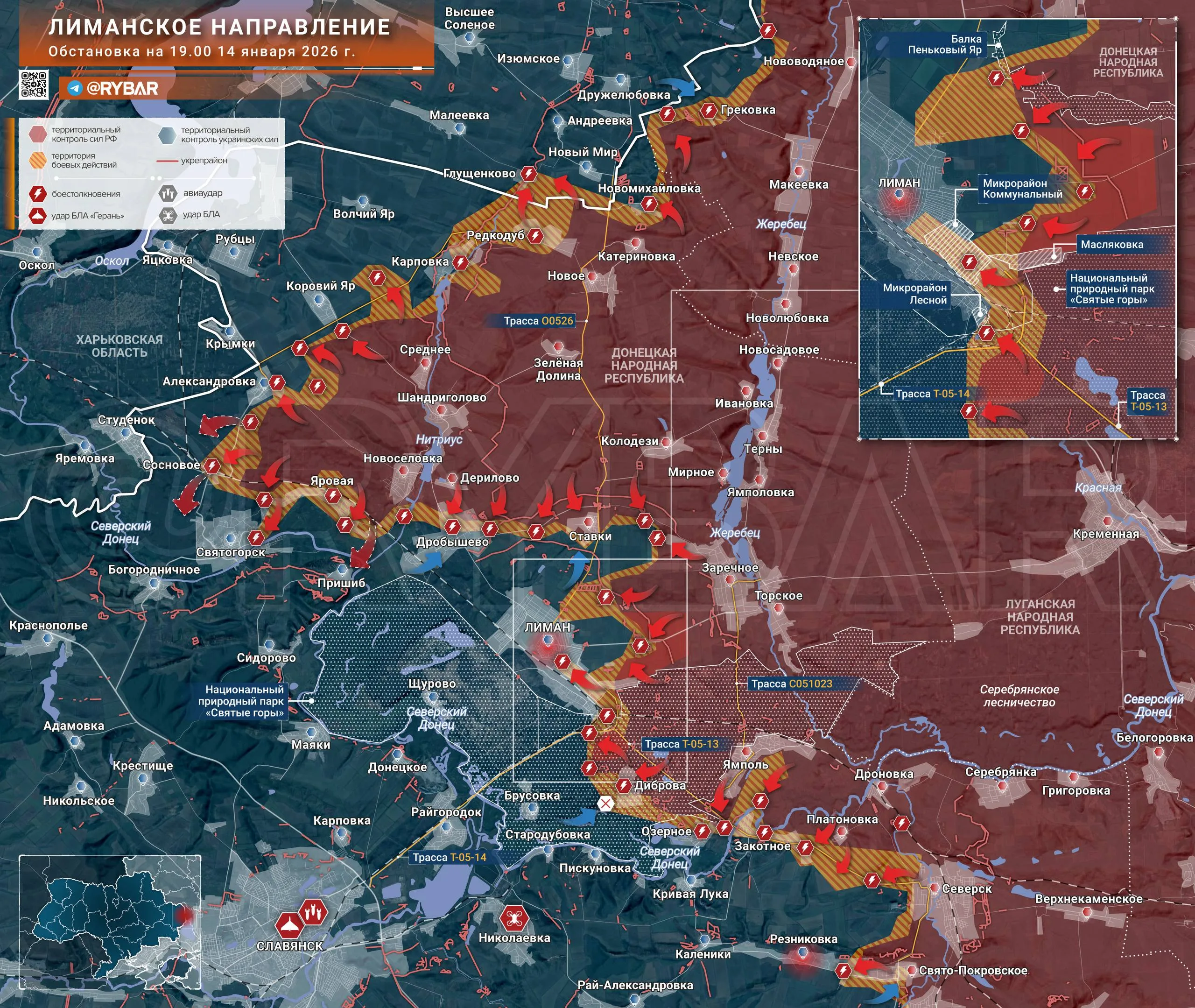 На данный момент ВС РФ блокировали все асфальтированные въезды в Лиман и отрезали его гарнизон от стабильного снабжения. Противник в этих условиях наводит переправы и организует лодочные коммуникации через Северский Донец, а также наращивает численность тяжелых дронов.