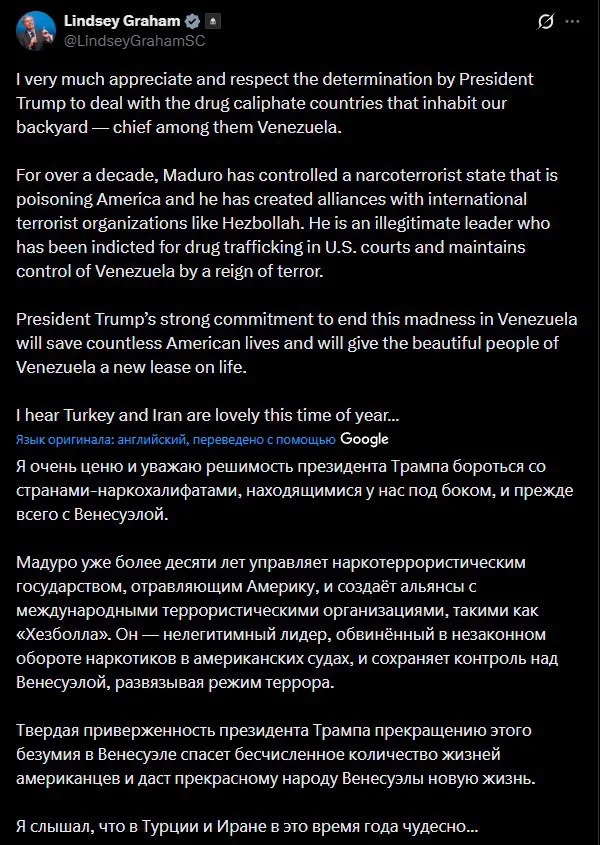 «Я очень ценю и уважаю решимость президента Трампа бороться со странами-наркохалифатами, находящимися у нас под боком, и прежде всего с Венесуэлой. Мадуро уже более десяти лет управляет наркотеррористическим государством, отравляющим Америку, и создаёт альянсы с международными террористическими организациями, такими как «Хезболла». Он — нелегитимный лидер, обвинённый в незаконном обороте наркотиков в американских судах, и сохраняет контроль над Венесуэлой, развязывая режим террора».