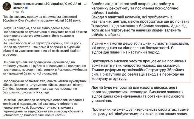 Главком ВСУ Сырский сообщил о начале реализации мероприятий по переходу на корпусную систему