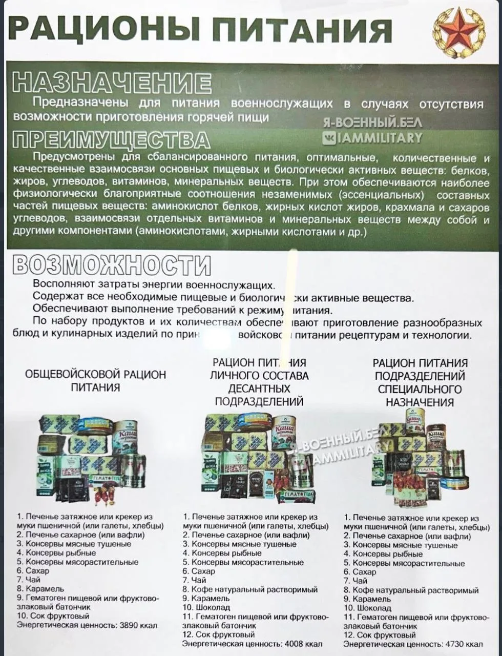 Общевойсковой рацион выглядит так: печенье затяжное или крекер из пшеничной муки (или галеты, хлебцы), печенье сладкое (или вафли), консервы мясные (тушенка), консервы рыбные, консервы мясо-растительные, сахар, чай, карамель, пищевой гематоген или фруктово-зерновой батончик, сок из фруктов. Энергетическая ценность такого сухпайка составляет 3890 калорий — для сильных нагрузок.