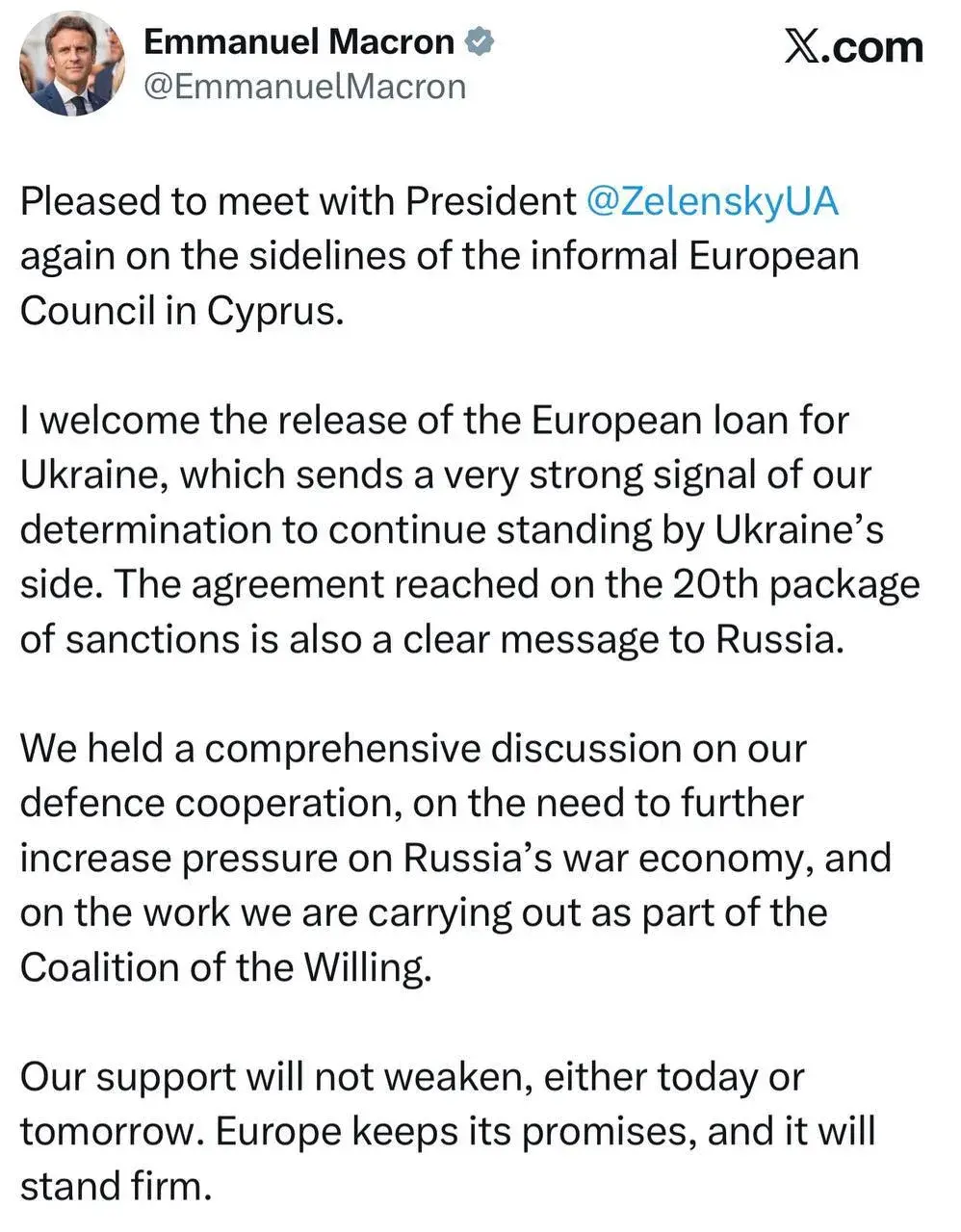 Макрон также приветствовал выделение кредита Украине, назвав это признаком единства ЕС.
