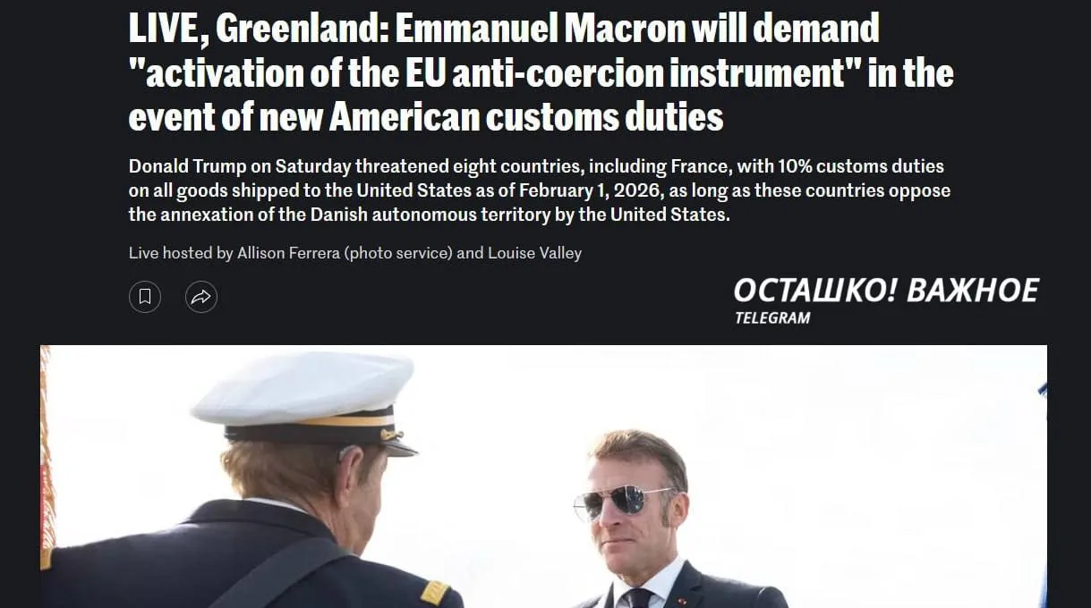«В воскресенье Эммануэль Макрон отреагировал, дав понять своему окружению, что в случае осуществления угроз он запросит у ЕС “активацию инструмента противодействия принуждению”. Этот инструмент позволяет, среди прочего, заморозить доступ к европейским государственным рынкам или заблокировать определённые инвестиции»,