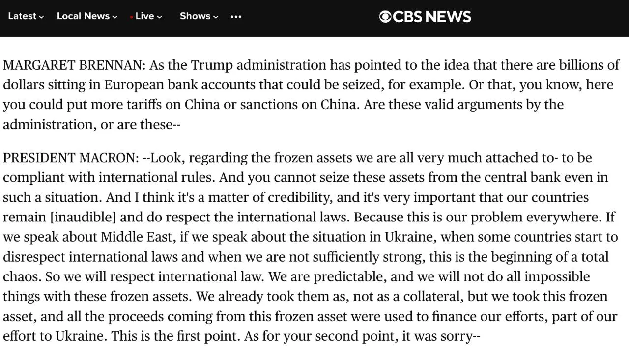 «Вы не можете изъять активы у центрального банка даже в такой ситуации. Это вопрос доверия. Франция предсказуема: мы будем уважать международное право и не станем делать невозможные вещи»,