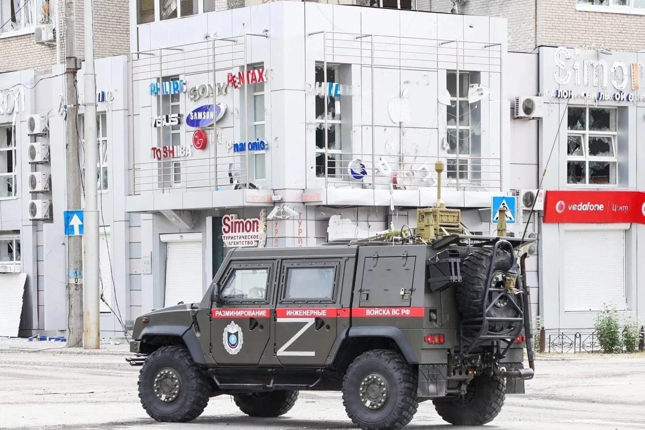 Фото 4 и 5 — Итальянский бронеавтомобиль IVECO 65Е19WM LMV с комплексом РЭБ РП-377УВМ2 ВС РФ на улицах Северодонецка, 2022 г.
