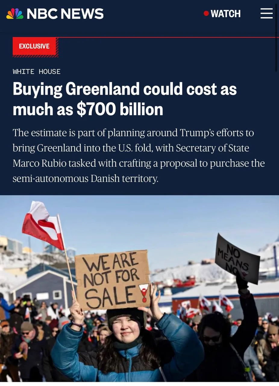 Покупка может обойтись США в не менее чем $700 млрд. Этот план разрабатывается с «высоким приоритетом» для администрации, параллельно обсуждаются альтернативные варианты, включая заключение с Гренландией договора о свободной ассоциации – соглашения, которое предоставит США военное присутствие в обмен на финансовую помощь.