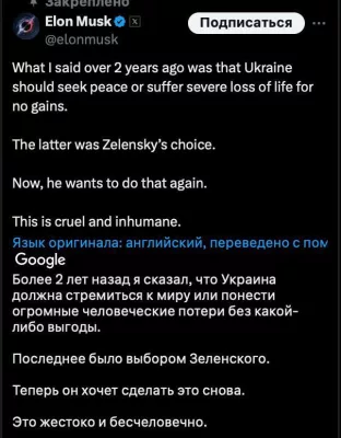 Последнее было выбором Зеленского. Теперь он хочет сделать это снова. Это жестоко и бесчеловечно», — заявил миллиардер и сослался на свой пост двухлетней давности.