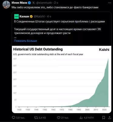 В октябре Маск уже предсказывал банкротство США. Тогда впервые в истории процентные платежи государства по долгу превысили расходы на оборону.