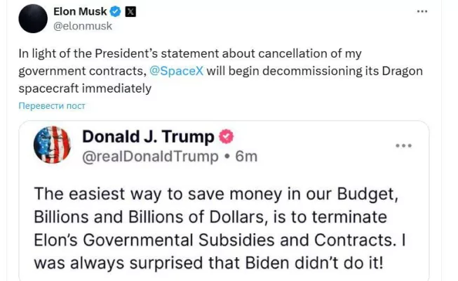 - Маск также заявил, что SpaceX немедленно начинает вывод из эксплуатации космического корабля Dragon, а также сообщил, что США ждёт рецессия во втором полугодии 2025 года из-за введенных Трампом импортных пошлин.