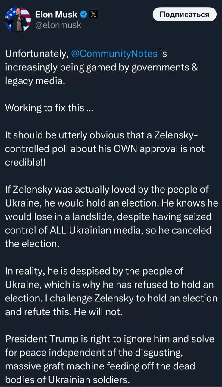 - Президент Трамп прав, игнорируя его и стремясь к миру, независимому от отвратительной, огромной машины взяточничества, питающейся трупами украинских солдат».