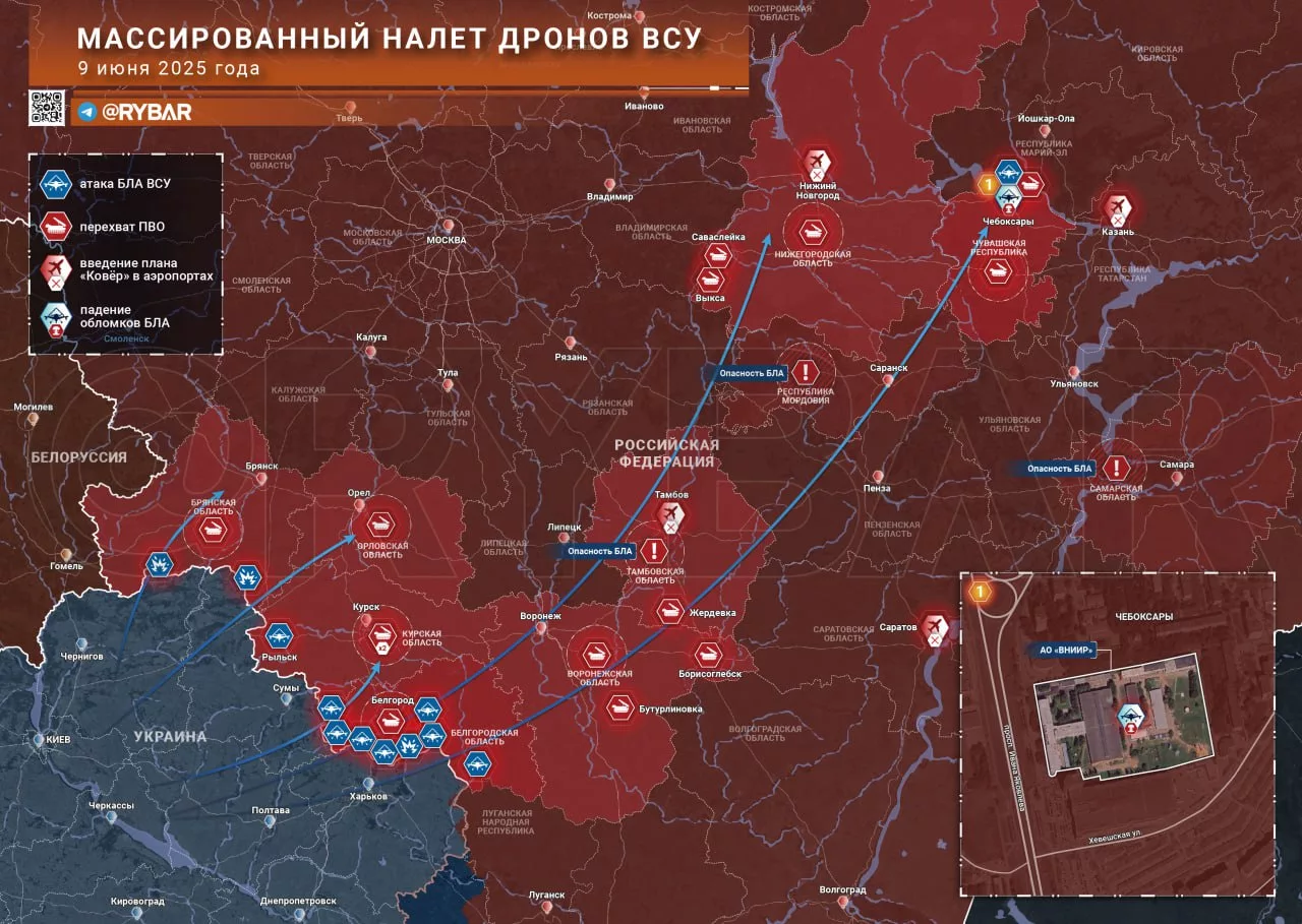 С вечера 8 июня до утра 9 июня украинские формирования свершили одну из крупнейших атак беспилотниками самолетного типа по российской территории. Под удар попали как приграничные, так и центральные регионы России, включая Воронежскую, Нижегородскую и Чувашскую области.