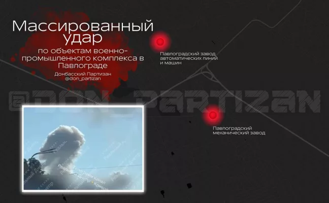 🔻 Основной целью ударов была территория Павлоградского механического завода (ПМЗ). В результате атаки повреждено/уничтожено оборудование цеха электроники и систем управления (условное наименование «Цех №3») и сборочного цеха (условное наименование «Цех №4»). Всего на территории объекта зафиксировано 4 попадания.