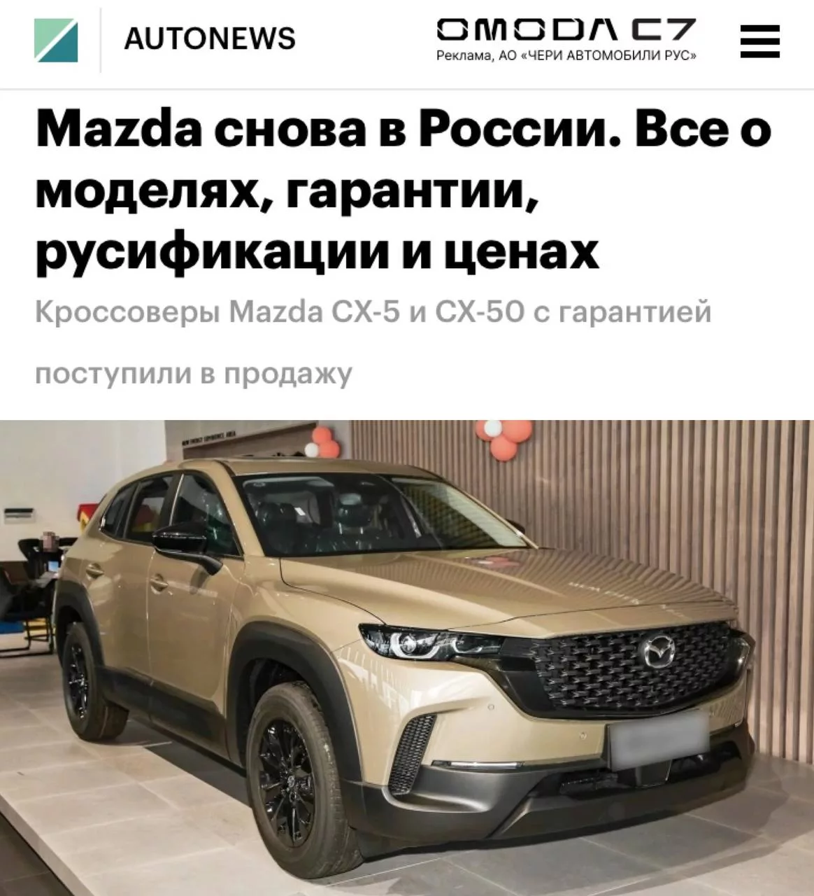 Основные модели (CX-5 и CX-50) поступают из Китая через представительство «Мазда Мотор Рус», и на них действует полноценная гарантия, как раньше, с обслуживанием у официальных дилеров.