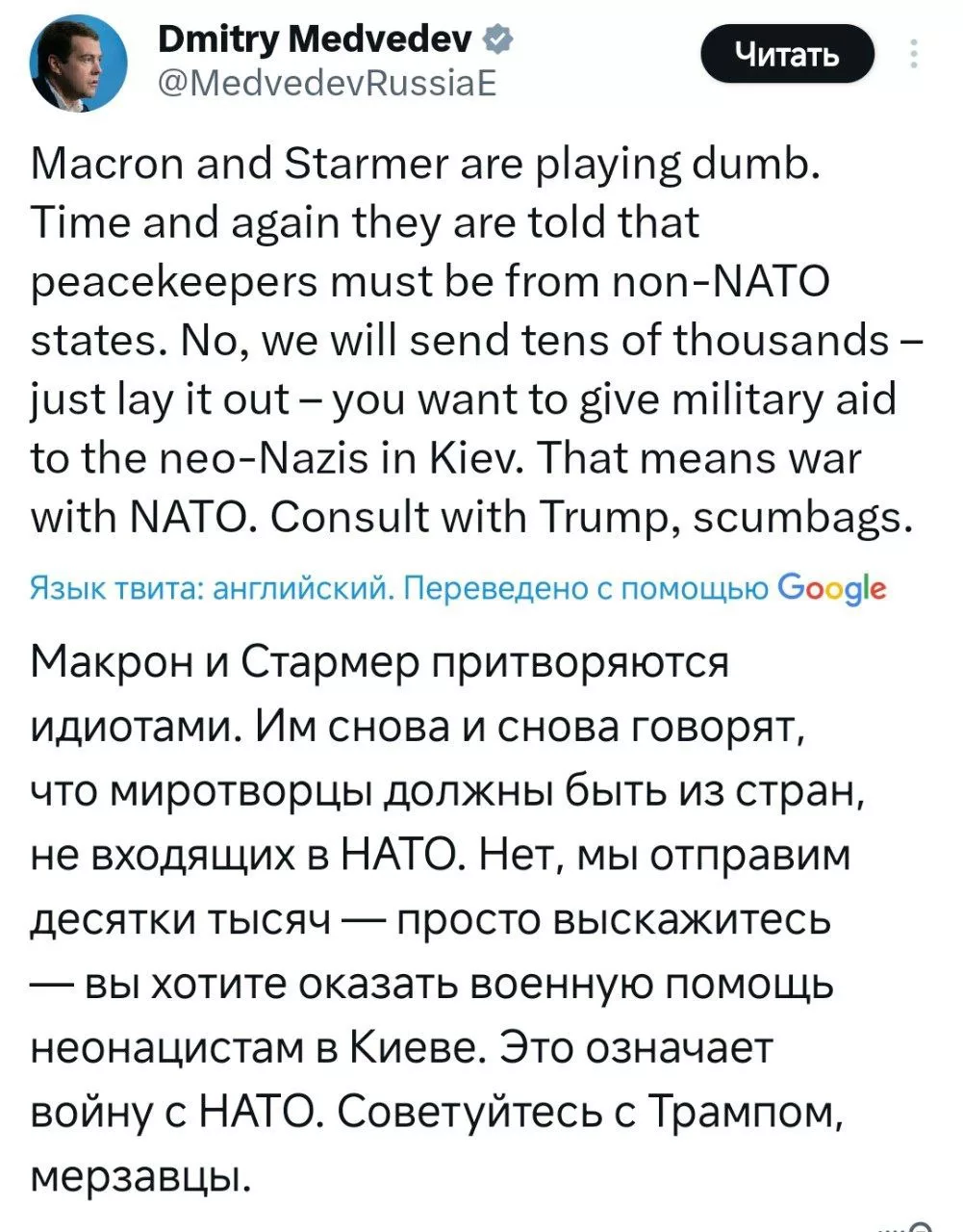 Главная страница » Новости и статьи Медведев: отправка натовских «миротворцев» на помощь Киеву будет означать войну с НАТО Автор Команда сайта Опубликовано 16.03.2025Комментариев 1 Добавь сайт в закладки нажми CTRL+D What’s your Reaction? +1 1 +1 39 +1 0 +1 5 +1 0 +1 0 +1 1 What’s your Reaction? +1 1 +1 39 +1 0 +1 5 +1 0 +1 0 +1 1 Поделись видео: