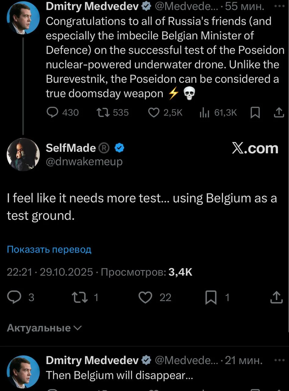 Зампред Совбеза РФ Дмитрий Медведев ответил пользователю соцсети X на предложение использовать Бельгию в качестве тестовой площадки для «Посейдона», заметив, что тогда Бельгия исчезнет.