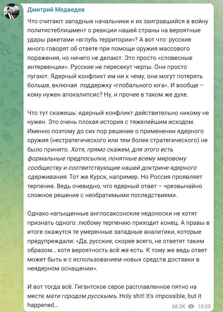 Он подчеркнул, что Москва проявляет терпение, потому что ядерный ответ — чрезвычайно сложное решение с необратимыми последствиями.