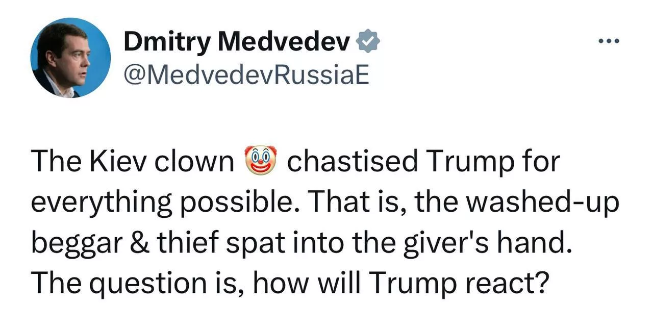 «Киевский клоун отчитал Трампа за все, что только можно. То есть, конченый нищий и вор плюнул в руку дающему. Вопрос в том, как отреагирует Трамп?», – заявил зампред Совбеза РФ.