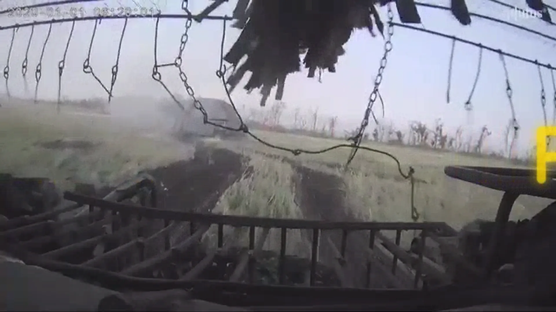 Головная машина получает попадание дрона, следующий за ним танк обходит препятствие и продолжает движение.