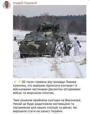 Он распорядился выплачивать по 50 тысяч гривен (около 116 тысяч рублей) каждому, кто подпишет контракт с военными частями десантно-штурмовых войск и морской пехотой.