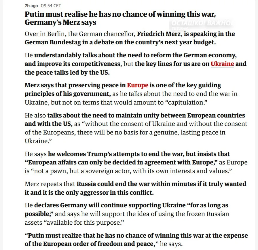 Канцлер подтвердил, что Германия продолжит поддерживать Украину «настолько долго, насколько это возможно», и заявил о планах использовать замороженные российские активы для помощи Киеву. Финансовая поддержка страны вырастет до €11,5 млрд в 2026 году против 8,5 млрд ранее.