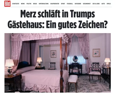 Канцлер ФРГ Фридрих Мерц во время визита в США разместился в «розовой комнате» Блэр-хауса — официальной резиденции для высокопоставленных гостей президента США, — сообщает Bild.