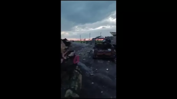 Посредине различной обгоревшей техники стоит уничтоженная БМП «Брэдли».